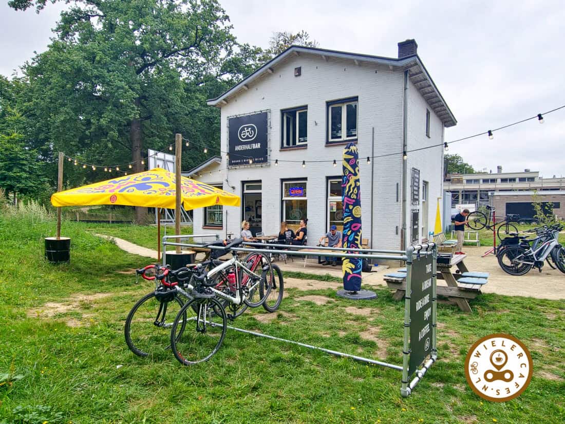 Wielercafé Anderhalf Bar ligt pal aan een fietspad met deels zicht op het aanliggende bos. Vele fietsers passeren, ik wil ze bijna roepen om hier ook een stop te maken.
