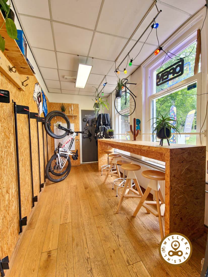 Binnen sieren diverse fietsobjecten de ruimtes. De stijl van het café is losjes. De eigenaar wil dat iedereen zich welkom voelt. Fietsliefhebbers, wandelaars, mensen uit de buurt en meer. Blijkbaar hadden sommige wielrenners in het begin, twee jaar geleden, de indruk dat het café alleen op mountainbikers gericht is. Dat verbaast me., want inmiddels straalt helemaal niets dat nog uit. Het is duidelijk dat het om fietsen gaat in de breedste zin van het woord èn ook dat iedereen welkom is.