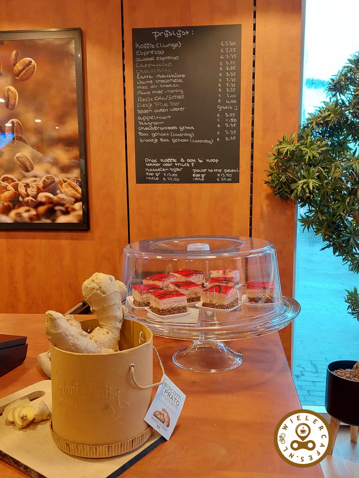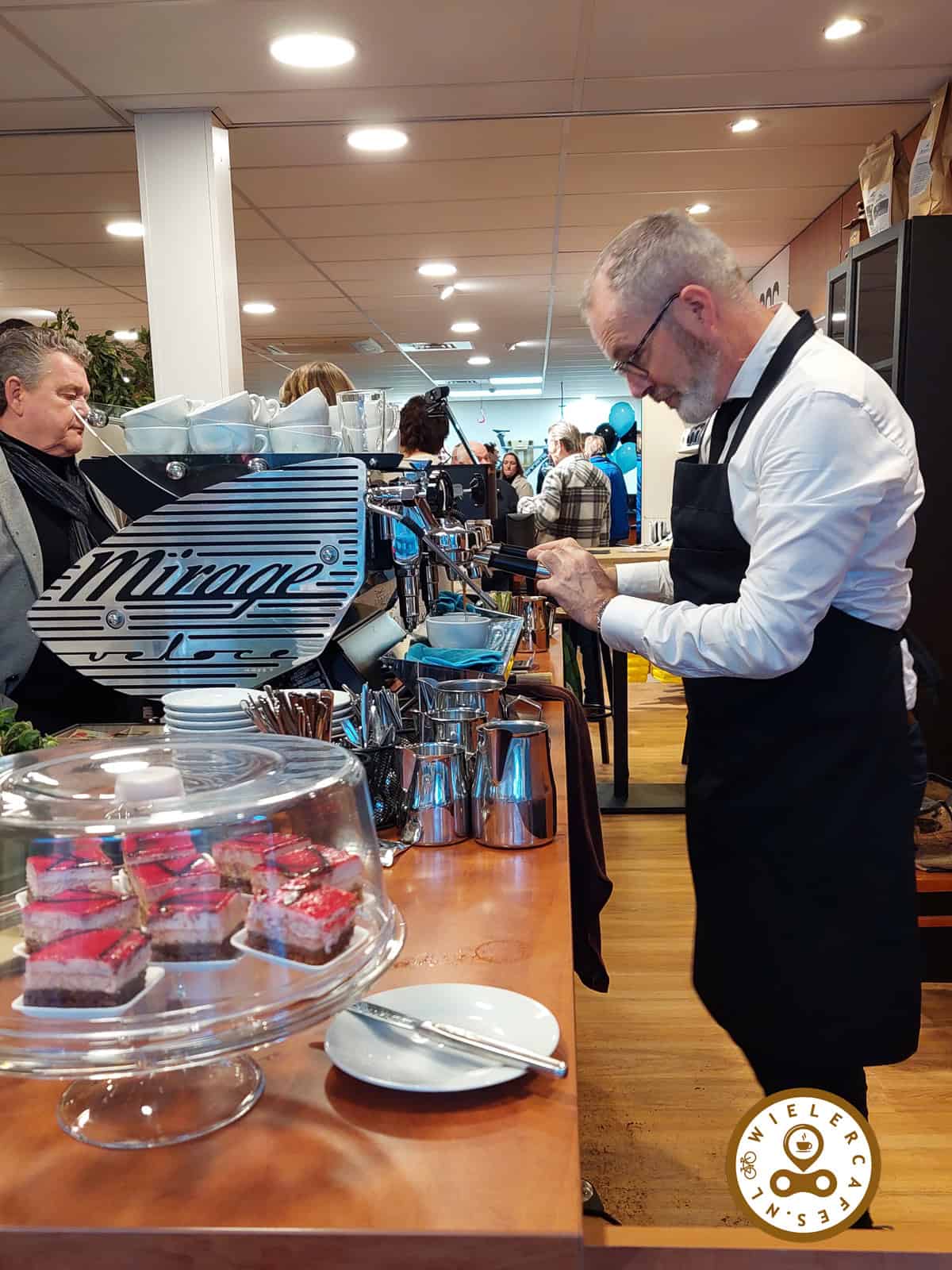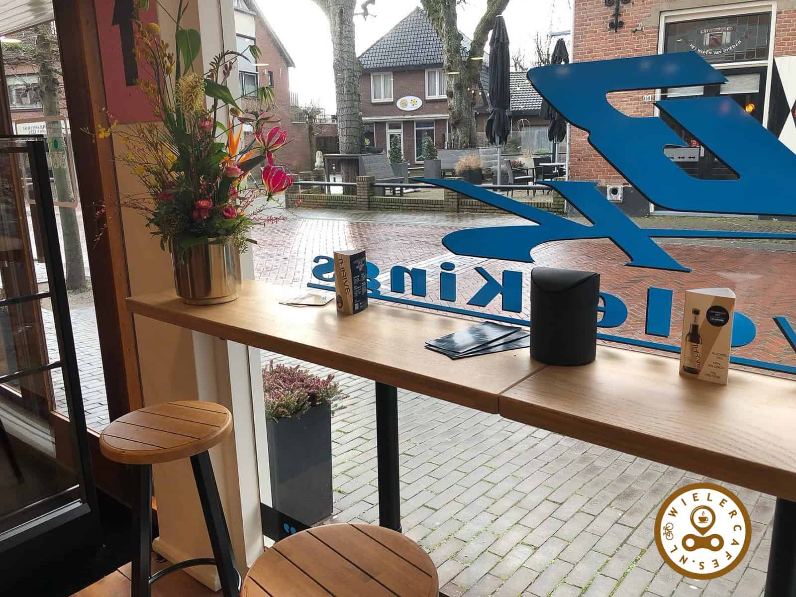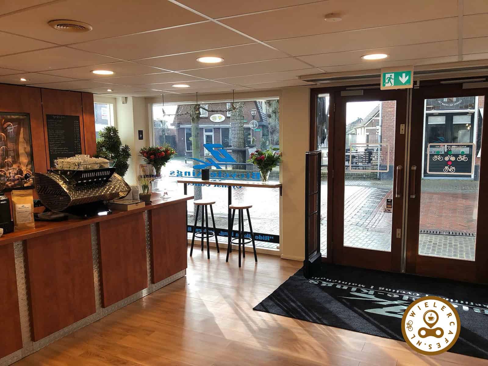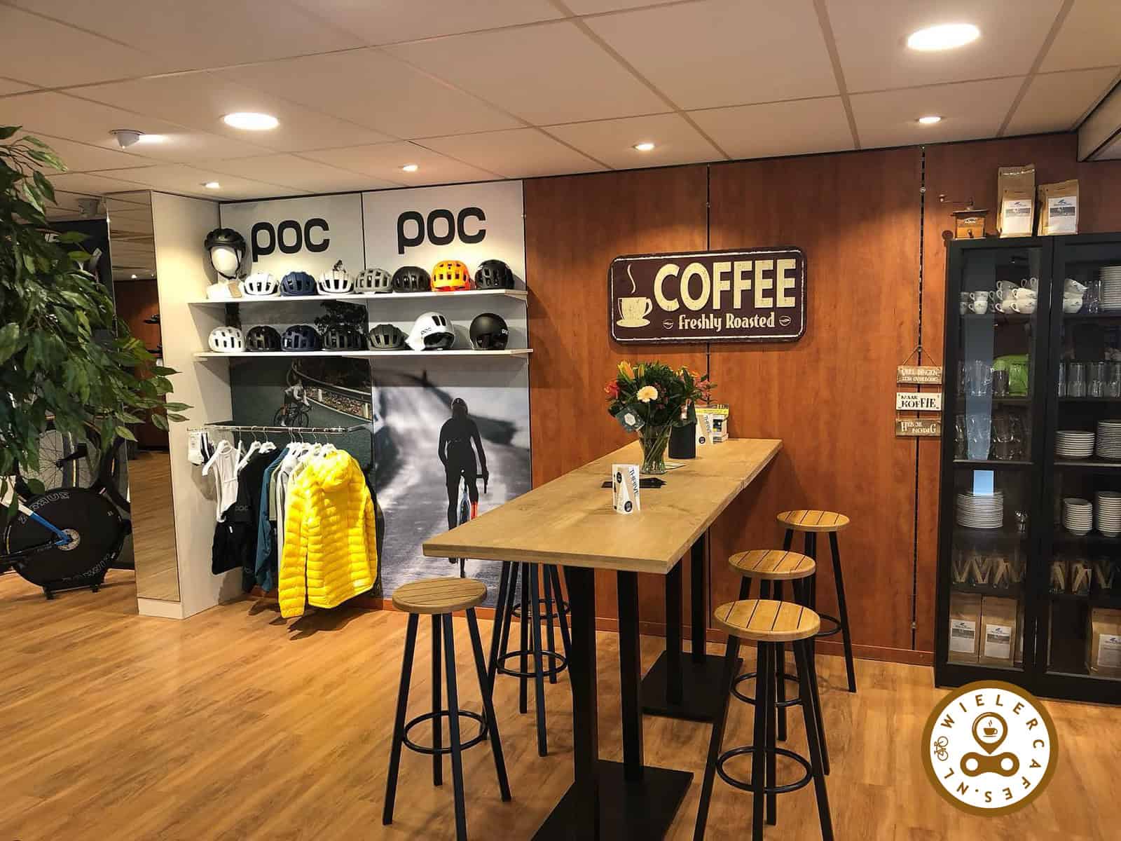 Van buiten zie je direct een koffiebar aan de ene kant en grote leestafels aan de andere kant. Het ruim opgezette wielercafé biedt plaats voor zo’n 25 zitplaatsen, zodat ook groepen fietsers even hun welverdiende pauze kunnen nemen. Hierbij kan de appeltaart uiteraard niet ontbreken. Daarnaast wordt er zaterdags ook een broodje bal gehakt geserveerd en kan men de bidon gratis vullen.