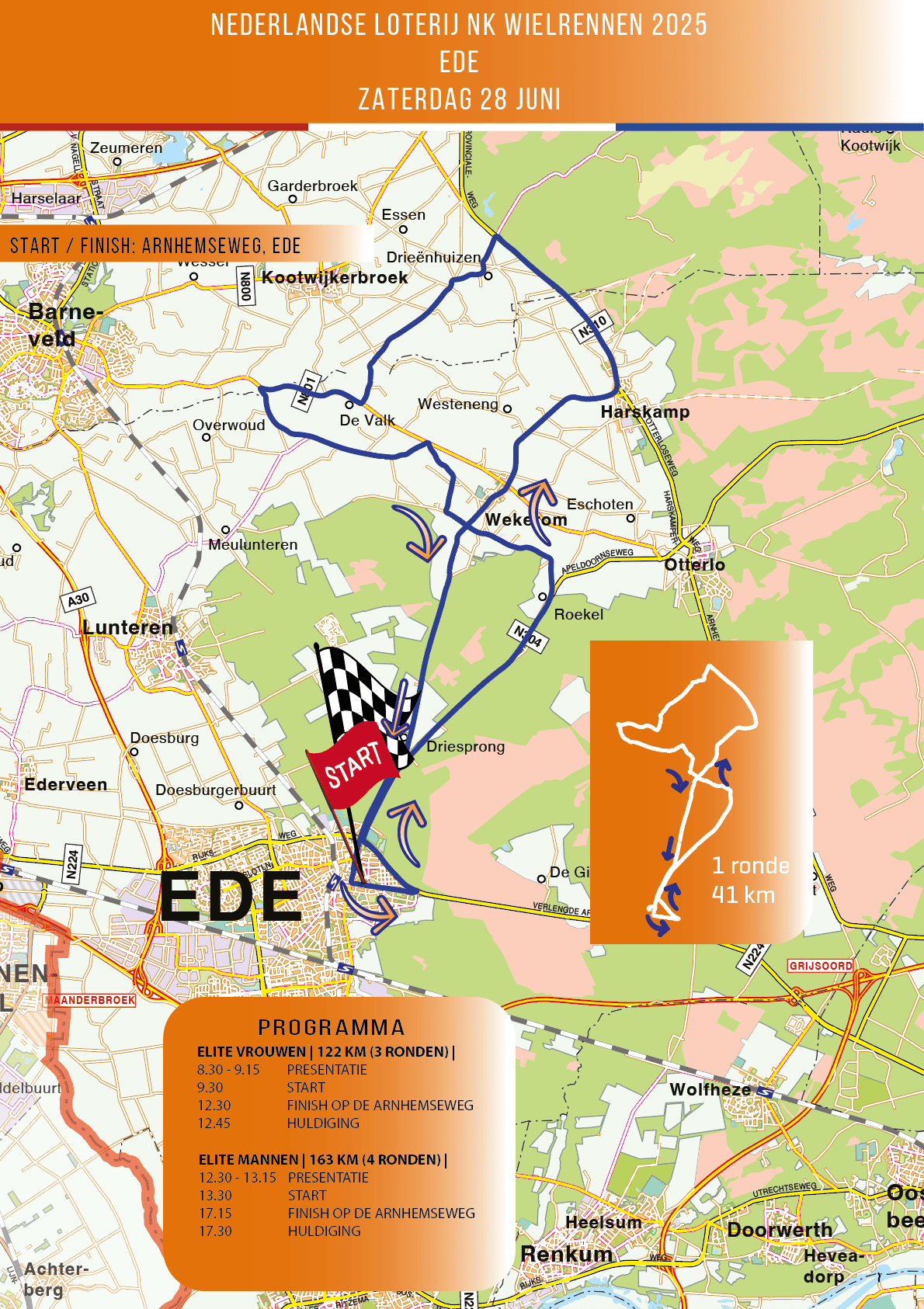 Het programma van het NK wielrennen in Ede voor mannen en vrouwen op 28 juni 2025 is als volgt: